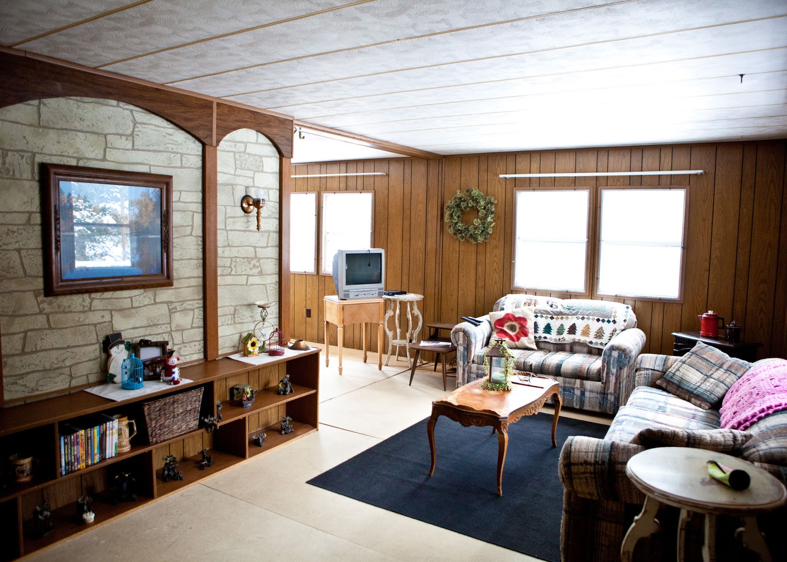 John likes this wall so it's been decided to leave it as is. I was going to paint or rip it apart but it's a cottage and it looks fine and I'm starting to actually like it. Oh yeah the shade is missing from the right light.... yeah I broke it while cleaning. Hoping to find one at a thrift store :)