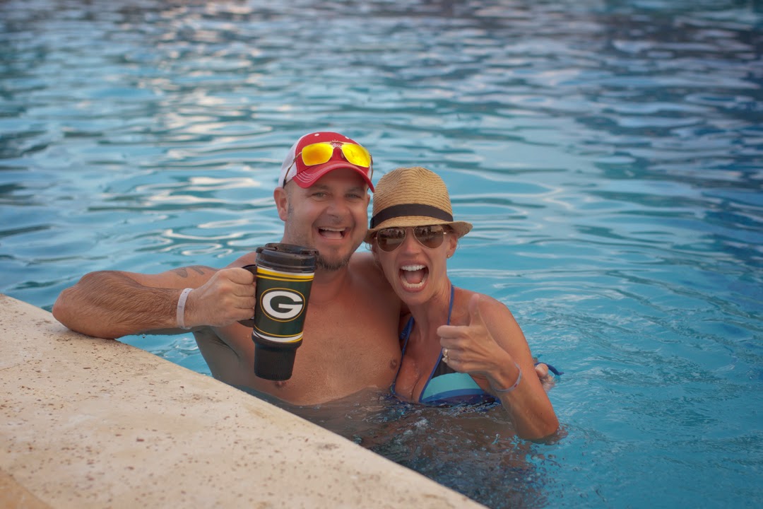 We had moved to a new location at the pool this morning and sitting right next to us was a couple that lives in Green Bay. How crazy is that to sit right next to them. They had a Packer mug and a Badger mug..... good tip for those going on vacation. Take your states logos, the people from your area will find you very easily. They were on their last full day and we probably didn't make their flight home very enjoyable. We found out they have been to Beer Can Island where we party on the pontoon during our summer adventures with the neighbors.